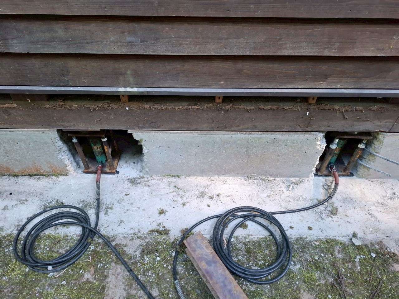 今回は建物が大きく重量があるため、外周部には油圧ジャッキを使用することになりました。本日はジャッキの設置と、そのための斫り作業を行いました。